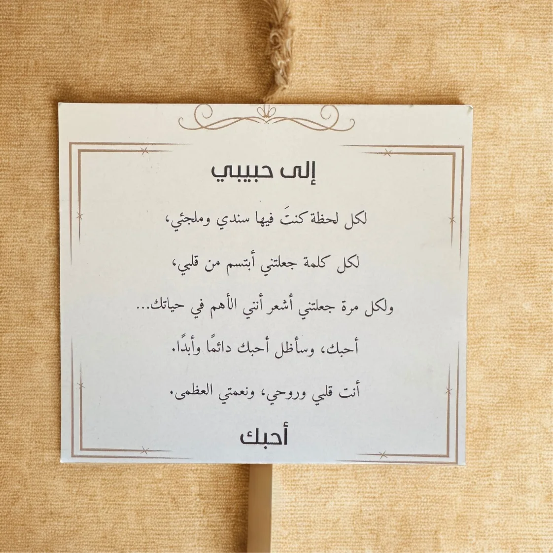 إلى حبيبي، لكل لحظة كنت فيها سندي وملجئي، ولكل كلمة جعلتني أبتسم من قلبي، ولكل مرة جعلتني أشعر أنني الأهم في حياتك… أحبك، وسأظل أحبك دائمًا وأبدًا. أنت قلبي وروحي، ونعمتي العظمى.